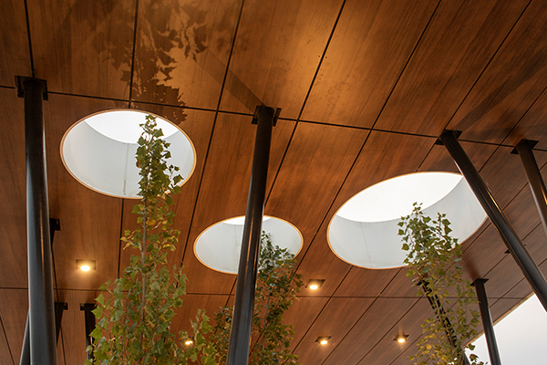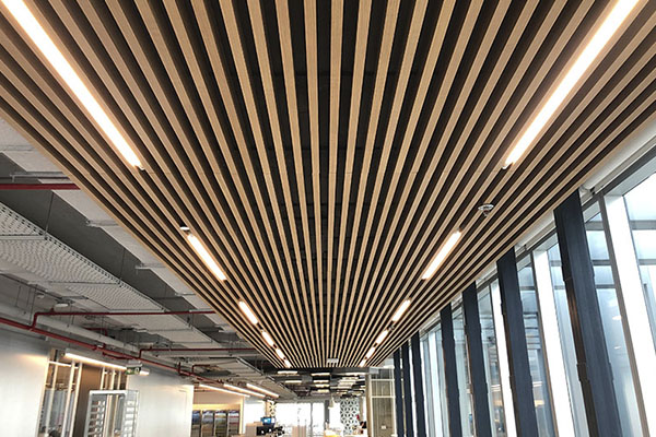 ya que si queremos conseguir absorción con un material blanco, perforado, ubicado en un lugar alto, podemos utilizar placas de PLATTEN MAD de CG, que se percibe casi como una superficie lisa”.