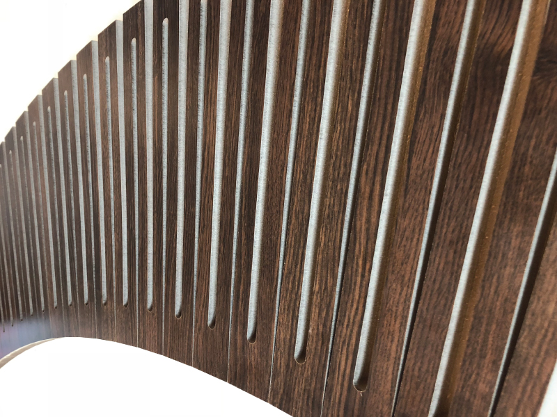 Las ranuras y perforaciones estratégicamente colocadas en el material le otorgan el movimiento y resistencia deseado para conseguir distintos radios de curvaturas posibles. Las uniones y fijaciones de estos paneles se logran ocultar con piezas y/o métodos específicos para mantener la estética del revestimiento.