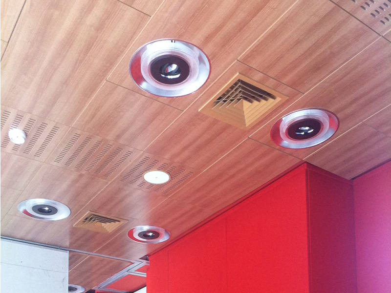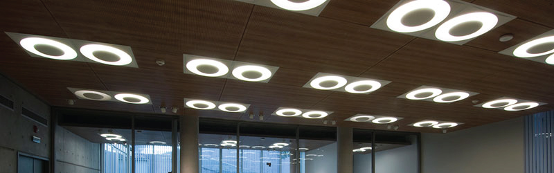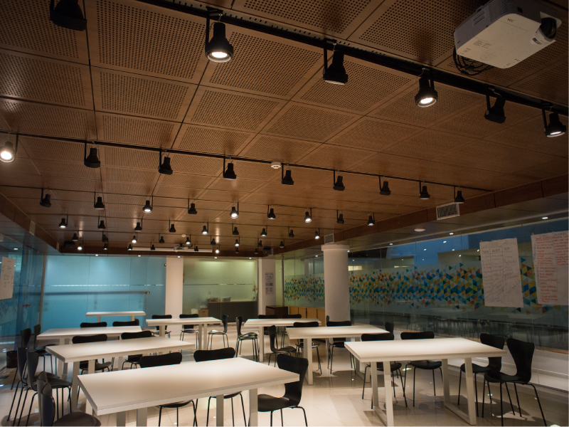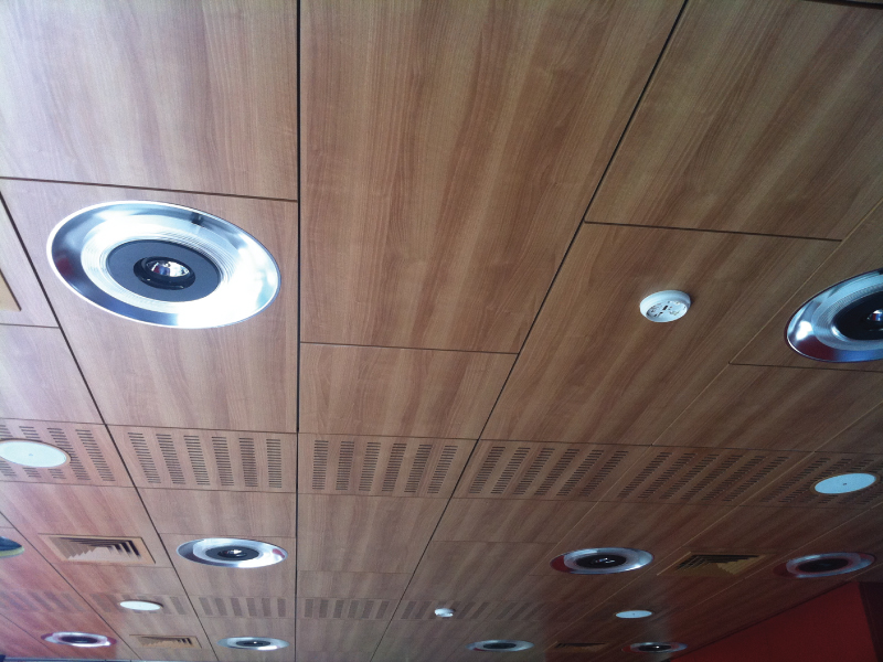 El sistema de cielorrasos Modula son bandejas desmontables laminadas de maderas tecnológicas Platten® sobre un alma de MDF.