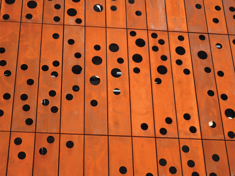 Los paneles metálicos Screendot, pueden ser lisos o perforado en aluminio, acero o en acero Cortén. Permiten revestir fachadas con tanta originalidad que el proyectista puede crear su propio diseño basándose en el juego de libre perforaciones.