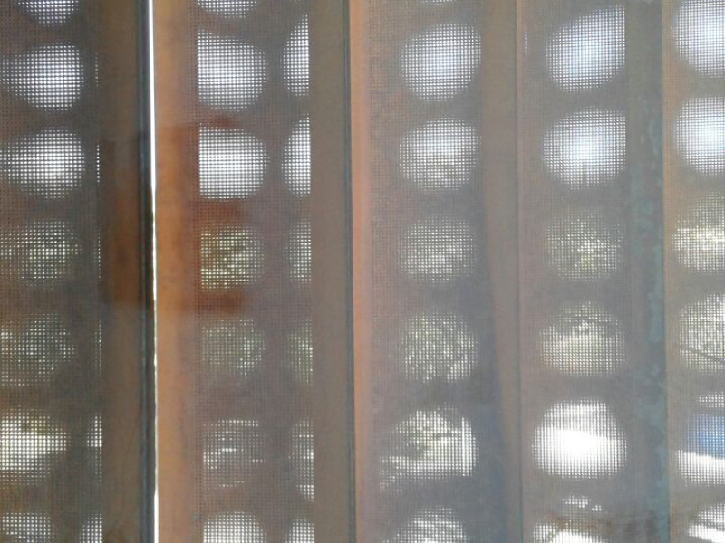 El parasol SCREENDOT DUO tiene un efecto visual interesante al crearse un juego de figuras diferentes según el punto del observador por las perforaciones que posee.